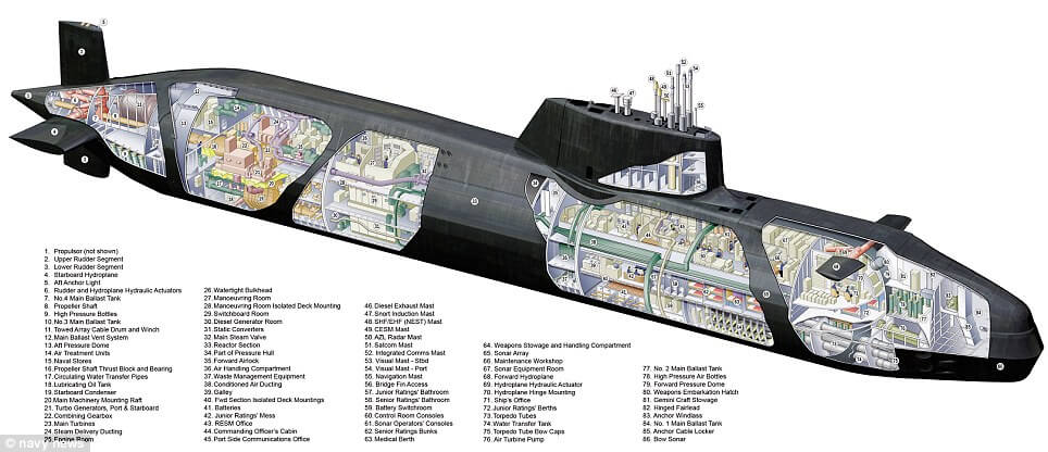The commander of the submarine, Peter Green, said that the abilities of the sub are ‘unparalleled.’ ‘This sub is a huge step forward in underwater operations,’ he told the Daily Mirror. ‘Her listening ability is quite awesome. She has a sonar system with the processing power of 2,000 laptop computers. It is possible this class of submarine is the most advanced in the world.’