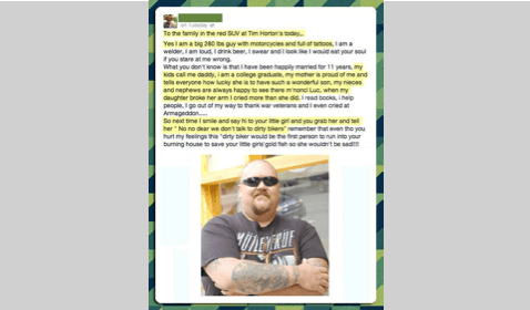On the well trafficked blog website, Cheezburger.com there is an article posted titled, “Think Twice before Judging That Big, Burly Guy.” The post is a letter aimed at “the family in the red SUV at Tim Horton’s today,” in response to the happily married, college graduate and father, who also just so happens to be a 280lb guy covered in tattoos, being shunned and called a “dirty biker.”