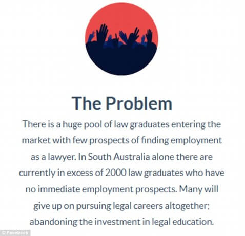 The Adelaide-based firm, Adlawgroup, promised it would give law grads full-time employment for a period of two years after the grads ponied up. On its website, the firm stated the program would create opportunity for some “2,000 law graduates” with “no immediate employment prospects,” even posting this ad: