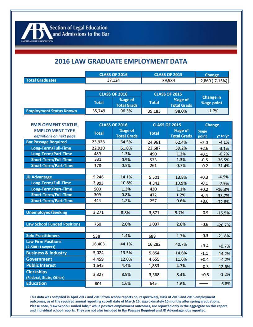 A big part of the change in percentages is from smaller graduating classes. The actual number of jobs obtained went down 4 percent. In 2015, 28,029 students had full-time long-term legal jobs compared to 2016 was only 26, 923. There were nearly 3,000 fewer students on the market in 2016.