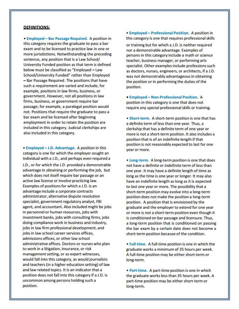 The report is put together by examining the reported data from the 204 ABA-approved law schools to the ABA Section on Legal Education and Admissions to the Bar. Of the collected data, they determined that 73 percent of all 2016 graduates had obtained full-time, long-term Bar Passage Required of J.D. Advantage jobs by 10 months after graduation. The previous year was 70 percent so things are looking up for the legal profession for new graduates. To better understand the different definitions for each type of reported job, look at the photo below: